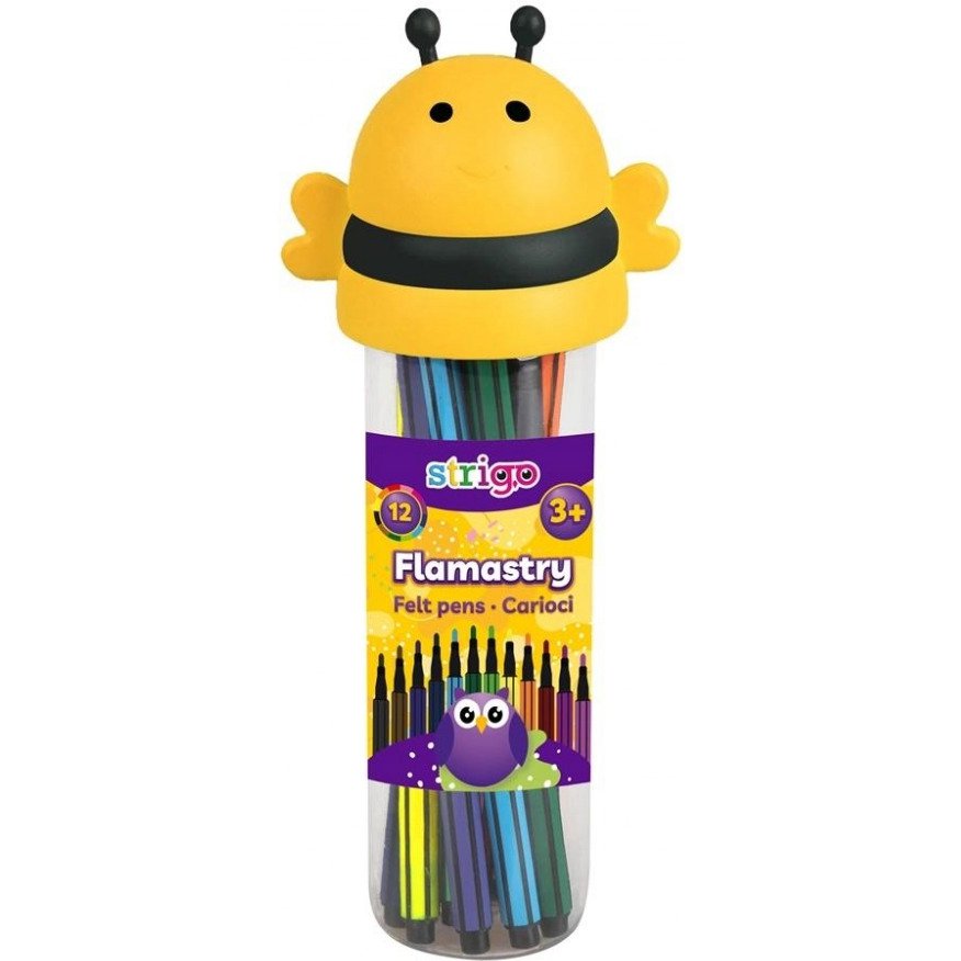 Flamastry Strigo Pszczółka. 12 głębokich kolorów flamastrów z łatwym do usunięcia tuszem, zamkniętych w uroczym pojemniku z główką w kształcie Pszczółki, jako zakrętka. Pozwalają na stworzenie prac pełnych kolorów. Flamastry posiadają tusz odporny na działanie światła. Tusz jest nietoksyczny, bezpieczny dla dzieci.