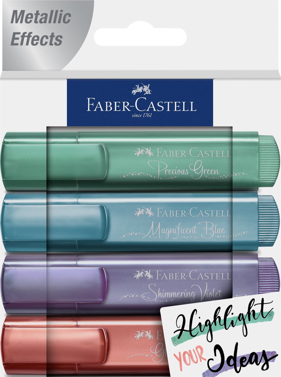 Zakreślacz 1546 Faber-Castell. Wysokiej jakości zakreślacz w metalicznych kolorach, który idealnie nadaję się do wszystkich rodzajów papierów. Efekt metaliczny tuszu zmienia się pod różnym oświetleniem. Wypełniony jest uniwersalnym tuszem na bazie wody. Dzięki odpowiednio ściętej, wytrzymałej końcówce ma szerokość linii pisania w zakresie od 1 do 5 mm. Dla najlepszych rezultatów zakreślania wstrząsnąć przed użyciem, przechowywać w pozycji poziomej. Zestaw 4 kolorów w ekologicznym, kartonowym opakowaniu (zielony, niebieski, fioletowy, czerwony). Obudowa i zatyczka wykonane z materiałów pochodzących z recyklingu.