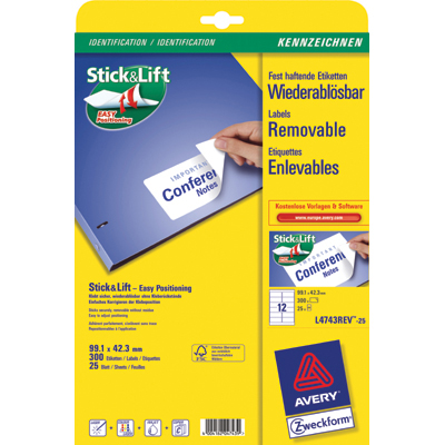 Etykiety usuwalne Stick&Lift Avery Zweckform -możliwość usunięcia lub zmiany pozycji etykiety bez pozostawienia śladu kleju-idealne przy:• zmianach treści dokumentów, segregatorów, pojemników• tworzeniu etykiet cenowych oraz kodów kreskowych -etykiety z certyfikatem FSC -wytworzone z papieru pochodzącego z ekologicznie zarządzanych obszarów leśnych -przeznaczone do wszystkich typów drukarek atramentowych, laserowych oraz kserokopiarek -etykiety Avery Zweckform można zaprojektować za pomocą DesignPro®5 -DARMOWEGO oprogramowania dostępnego na stronie www.avery-zweckform.pl